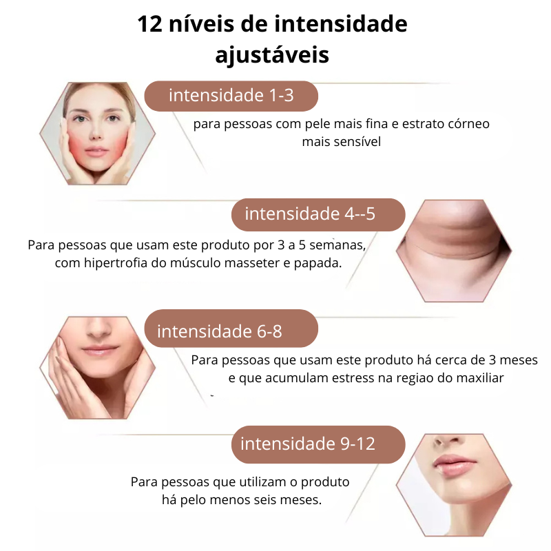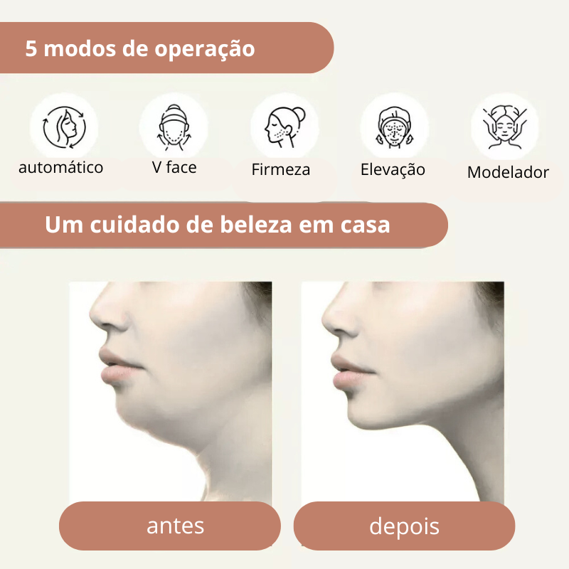 Com EMS de alta eficiência, 5 modos inteligentes e 12 níveis de intensidade, ele trabalha profundamente nos músculos faciais, estimula o metabolismo, ativa a circulação, reduz o edema e promove um efeito duradouro de rosto mais firme, tonificado e com formato em V.