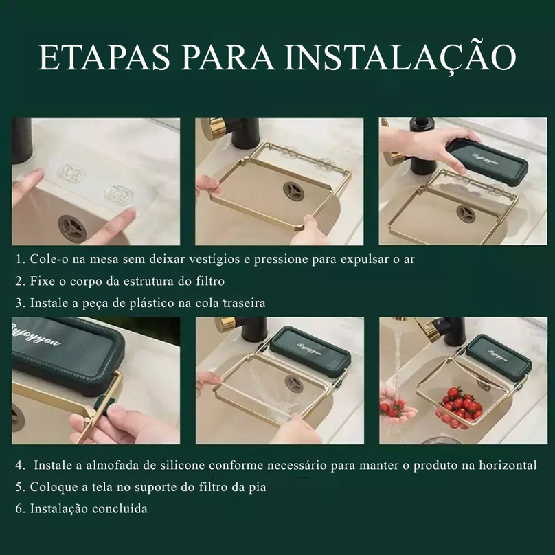 Além de funcional, o suporte pode ser colocado na vertical quando não estiver em uso, servindo até como suporte para panos. Uma solução compacta, higiênica e prática para evitar entupimentos e manter sua cozinha impecável.